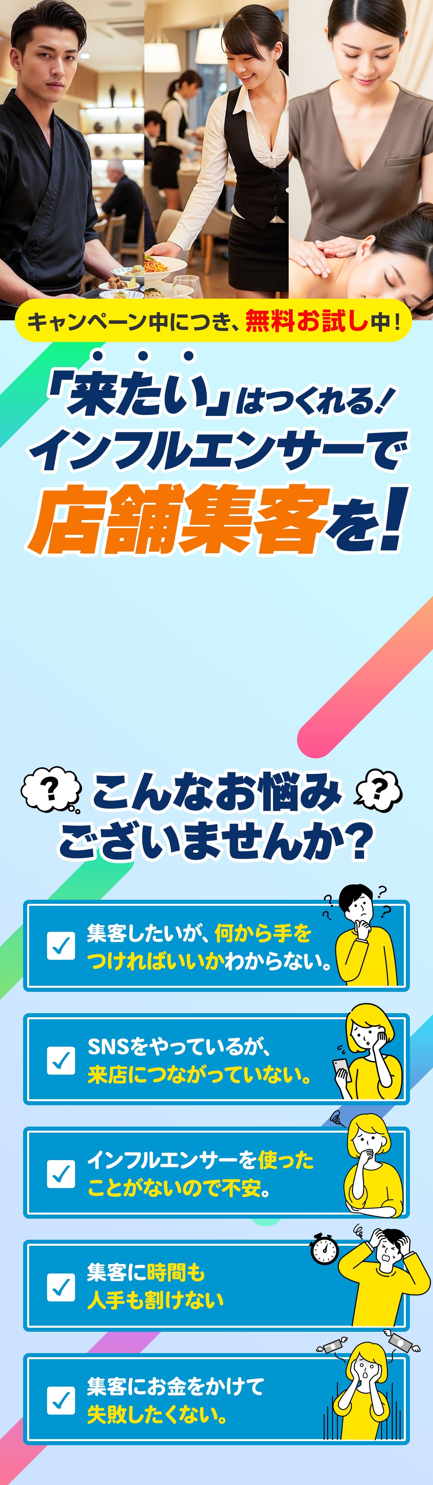 キャンペーン中につき、無料お試し中! 「来たい」はつくれる!インフルエンサーで店舗集客を!